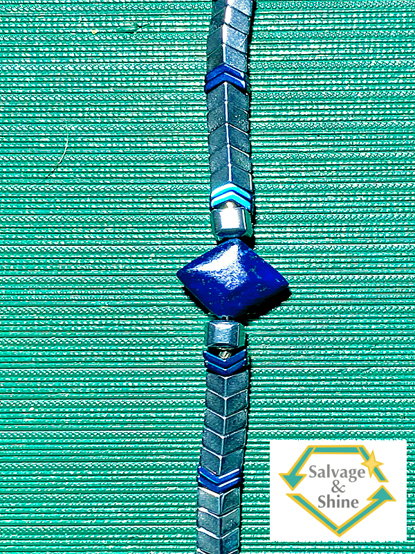 This bracelet is made from lapis lazuli, rhodium plated hematite, and aluminum beads and from silver-plated brass metals. This bracelet has a swivel lobster claw clasp closure and an aluminum extension chain.